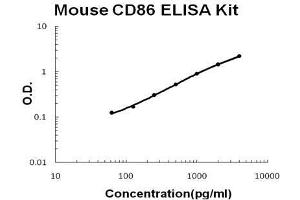 - mouse CD86 ELISA Kit is based on standard sandwich enzyme-linked immune-sorbent assay technology. A monoclonal antibody from rat specific for CD86 has been precoated onto 96-well plates. Standards (NSO, V26-G245) and test samples are added to the wells, a biotinylated detection polyclonal antibody from goat specific for CD86 is added subsequently and then followed by washing with PBS or TBS buffer. Avidin-Biotin-Peroxidase Complex is added and unbound conjugates are washed away with PBS or TBS buffer. HRP substrate TMB are used to visualize HRP enzymatic reaction. TMB is catalyzed by HRP to produce a blue color product that changed into yellow after adding acidic stop solution. The density of yellow is proportional to the mouse CD86 amount of sample captured in plate.