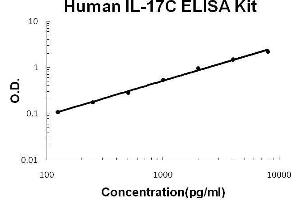 - human IL-17C ELISA Kit was based on standard sandwich enzyme-linked immune-sorbent assay technology. A monoclonal antibody from mouse specific for IL-17C has been precoated onto 96-well plates. Standards(E.coli, H19-V197) and test samples are added to the wells, a biotinylated detection polyclonal antibody from goat specific for IL-17C is added subsequently and then followed by washing with PBS or TBS buffer. Avidin-Biotin-Peroxidase Complex was added and unbound conjugates were washed away with PBS or TBS buffer. HRP substrate TMB was used to visualize HRP enzymatic reaction. TMB was catalyzed by HRP to produce a blue color product that changed into yellow after adding acidic stop solution. The density of yellow is proportional to the human IL-17C amount of sample captured in plate.