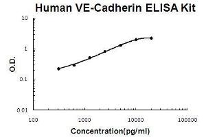 - human VE-Cadherin ELISA Kit was based on standard sandwich enzyme-linked immune-sorbent assay technology. A monoclonal antibody from mouse specific for VE-Cadherin has been precoated onto 96-well plates. Standards(NSO, D48-Q599) and test samples are added to the wells, a biotinylated detection polyclonal antibody from goat specific for VE-Cadherin is added subsequently and then followed by washing with PBS or TBS buffer. Avidin-Biotin-Peroxidase Complex was added and unbound conjugates were washed away with PBS or TBS buffer. HRP substrate TMB was used to visualize HRP enzymatic reaction. TMB was catalyzed by HRP to produce a blue color product that changed into yellow after adding acidic stop solution. The density of yellow is proportional to the human VE-Cadherin amount of sample captured in plate.