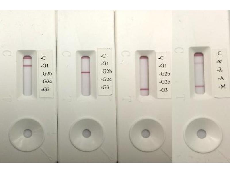 The isotyping kit has three different sizes with 5, 10 or 20 pouches containing two cassettes per pouch: one cassette is for determining IgG1, IgG2b, IgG2c (*) and IgG3, and the other cassette is for determining κ, λ, IgA and IgM.
