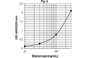 - The Etanercept ELISA is a sandwitch-type ELISA. Standards and diluted samples (serum or plasma) are incubated in the microtitre plate coated with recombinant human TNF-α (rh TNF-α). After incubation, the wells are washed. A horseradish peroxidase (HRP)-conjugated anti-human IgG monoclonal antibody is added and binds to the Fc part of Etanercept pre-captured by the rh TNF-α on the surface of the wells. Following incubation, the wells are washed and the bound enzymatic activity is detected by addition of chromogen-substrate. The colour developed is proportional to the amount of Etanercept in the sample or standard. Results of samples can be determined directly by using the standard curve.