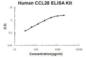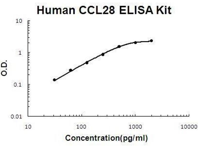 - human CCL28 ELISA Kit was based on standard sandwich enzyme-linked immune-sorbent assay technology. A monoclonal antibody from mouse specific for CCL28 has been precoated onto 96-well plates. Standards(Expression system for standard: E.coli, Immunogen sequence: I23-Y127) and test samples are added to the wells, a biotinylated detection polyclonal antibody from goat specific for CCL28 is added subsequently and then followed by washing with PBS or TBS buffer. Avidin-Biotin-Peroxidase Complex was added and unbound conjugates were washed away with PBS or TBS buffer. HRP substrate TMB was used to visualize HRP enzymatic reaction. TMB was catalyzed by HRP to produce a blue color product that changed into yellow after adding acidic stop solution. The density of yellow is proportional to the human CCL28 amount of sample captured in plate.