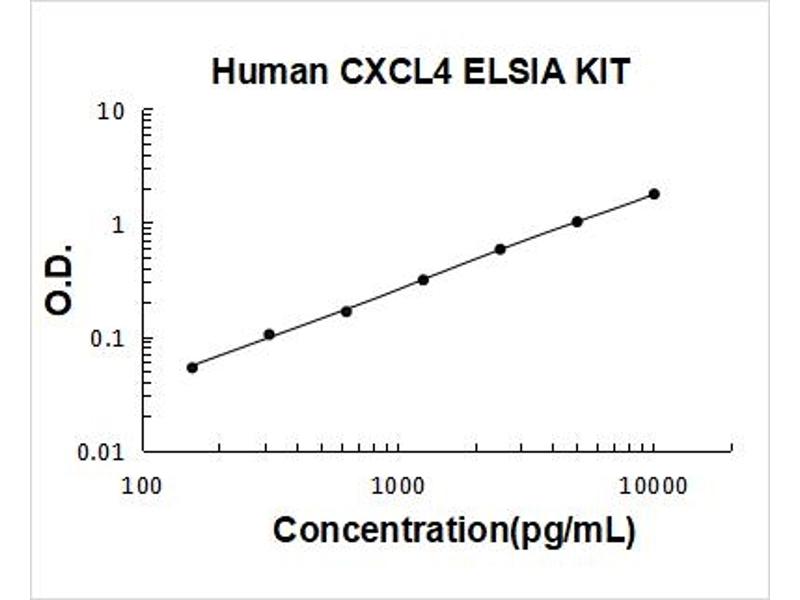 - human CXCL4 ELISA Kit was based on standard sandwich enzyme-linked immune-sorbent assay technology. A monoclonal antibody from mouse specific for CXCL4 has been precoated onto 96-well plates. Standards(Expression system for standard: E.coli, Immunogen sequence: E32-S101) and test samples are added to the wells, a biotinylated detection polyclonal antibody from goat specific for CXCL4 is added subsequently and then followed by washing with PBS or TBS buffer. Avidin-Biotin-Peroxidase Complex was added and unbound conjugates were washed away with PBS or TBS buffer. HRP substrate TMB was used to visualize HRP enzymatic reaction. TMB was catalyzed by HRP to produce a blue color product that changed into yellow after adding acidic stop solution. The density of yellow is proportional to the human CXCL4 amount of sample captured in plate.