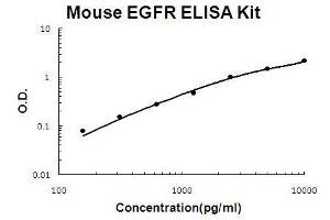 - mouse EGFR ELISA Kit was based on standard sandwich enzyme-linked immune-sorbent assay technology. A monoclonal antibody from rat specific for EGFR has been precoated onto 96-well plates. Standards(Expression system for standard: NSO, Immunogen sequence: L25-S647) and test samples are added to the wells, a biotinylated detection polyclonal antibody from goat specific for EGFR is added subsequently and then followed by washing with PBS or TBS buffer. Avidin-Biotin-Peroxidase Complex was added and unbound conjugates were washed away with PBS or TBS buffer. HRP substrate TMB was used to visualize HRP enzymatic reaction. TMB was catalyzed by HRP to produce a blue color product that changed into yellow after adding acidic stop solution. The density of yellow is proportional to the mouse EGFR amount of sample captured in plate.