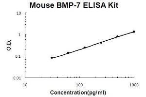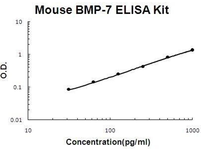 A monoclonal antibody from rat specific for BMP-7 has been precoated onto 96-well plates. Standards(Expression system for standard: CHO, Immunogen sequence: S292-H430) and test samples are added to the wells, a biotinylated detection polyclonal antibody from goat specific for BMP-7 is added subsequently and then followed by washing with PBS or TBS buffer. Avidin-Biotin-Peroxidase Complex was added and unbound conjugates were washed away with PBS or TBS buffer. HRP substrate TMB was used to visualize HRP enzymatic reaction. TMB was catalyzed by HRP to produce a blue color product that changed into yellow after adding acidic stop solution. The density of yellow is proportional to the mouse BMP-7 amount of sample captured in plate.