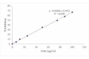 1.Calculate the absorbance at 553 nm as percentage of the absorbance of the uninhibited radical cation solution (Blank) according to the equation: Inhibition of A553 (%) = (1-Af/A0) x 100 Where A0 is the absorbance of uninhibited radical cation and Af is the absorbance measured 10 min after the addition of antioxidant samples. 2. Plot the inhibition of standards as a function of their final concentrations (Table 1 in book let). See Figure 2 for a typical standard curve ( see images). 3.Calculate the CEAC value of the samples using the equation obtained from the linear regression of the standard curve substituted inhibition percentage values for each sample.CEAC (μg/ ml) = (sample inhibition A553- intercept)/slope