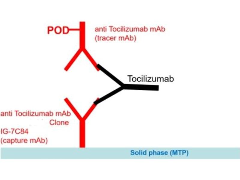 - This ELISA is based on Tocilizumab-specific monoclonal antibody (catcher Ab, clone 7C84). Standards and diluted samples are incubated in the microtitre plate coated with IG-7C84 mAb. After incubation, the wells are washed. Anti-Tocilizumab antibody conjugated to horse radish peroxidase (HRP) is added and binds to the Tocilizumab. Following incubation, wells are washed and the bound enzymatic activity is detected by addition of chromogen-substrate. The colour developed is proportional to the amount of Tocilizumab in the sample or standard. Results of samples can be determined by using the standard curve.