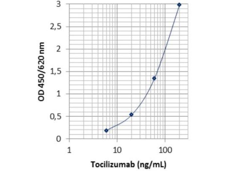 - Tocilizumab is a humanized monoclonal antibody (mAb) that specifically targets both soluble interleukin-6 receptor (sIL-6R) and membrane bound interleukin-6 receptor (mIL-6R) with high affinity, thereby preventing pro-inflammatory effects of IL-6. To present, the application of Tocilizumab is licensed for the treatment of RA, systemic juvenile idiopathic arthritis (sJIA) and Castleman's disease and represents a favorable efficacy in these diseases. Identification of biomarkers for (non-)response and risk factors for adverse drug reactions related to serum concentrations and therapeutic drug monitoring of Tocilizumab would be very helpful. The reliability of the data regarding the pharmacokinetics of Tocilizumab is expected to be highly dependent on the specificity of the assay used. Tocilizumab ELISA (mAb-based) is developed for the specific measurement of Tocilizumab in sera, plasma and other biological fluids by the advantage of using a site-directed IG-7C84 mouse monoclonal antibody (mAb) specific for Tocilizumab only. Binding of Tocilizumab to the solid phase, pre-coated with IG-7C84, is inhibited by recombinant human interleukin-6 receptor alpha (rh-IL6Rα) in a concentration dependent manner. Therefore, the Tocilizumab ELISA (mAb-Based) measures the free form of Tocilizumab. The choice of specifically measuring the free form allows investigators to analyze the concentration-effect relationship. The Tocilizumab ELISA (mAb-Based) Kit can be efficiently used for monitoring free Tocilizumab levels in serum and plasma.