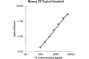 - Transferrin (TF) is a secreted protein which belongs to the transferrin family. It is expressed by the liver and secreted in plasma. TF has a molecular weight of around 80 KDa and contains two specific high-affinity Fe (III) binding sites.