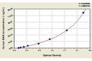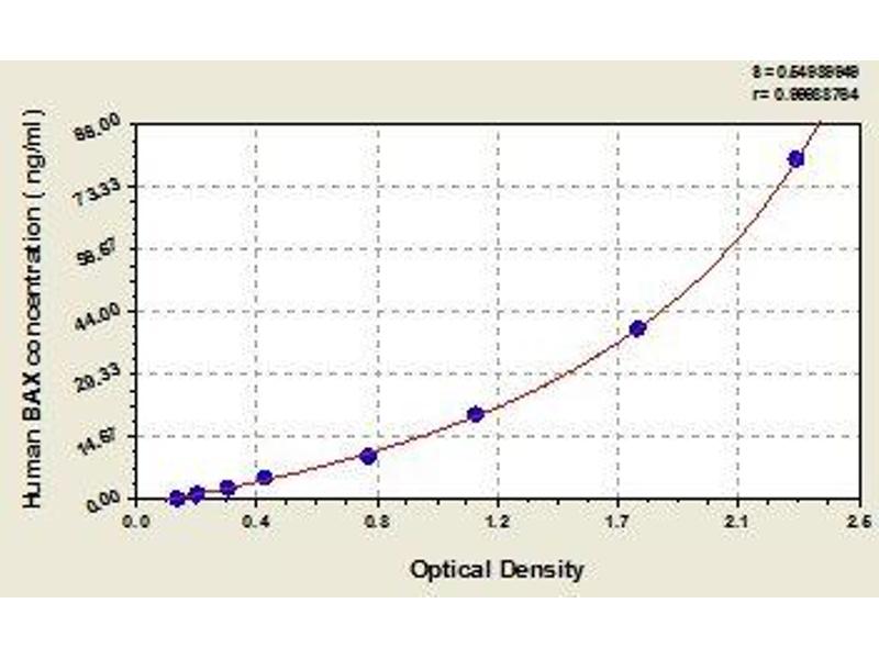 - The microtiter plate provided in this kit has been pre-coated with an antibody specific to BAX. Standards or samples are then added to the appropriate microtiter plate wells with a biotin-conjugated antibody preparation specific for BAX and Avidin conjugated to Horseradish Peroxidase (HRP) is added to each microplate well and incubated. Then a TMB (3,3',5,5' tetramethyl-benzidine) substrate solution is added to each well. Only those wells that contain BAX, biotin-conjugated antibody and enzyme-conjugated Avidin will exhibit a change in color. The enzyme-substrate reaction is terminated by the addition of a sulphuric acid solution and the color change is measured spectrophotometrically at a wavelength of 450 nm ± 2 nm. The concentration of BAX in the samples is then determined by comparing the O.D. of the samples to the standard curve.