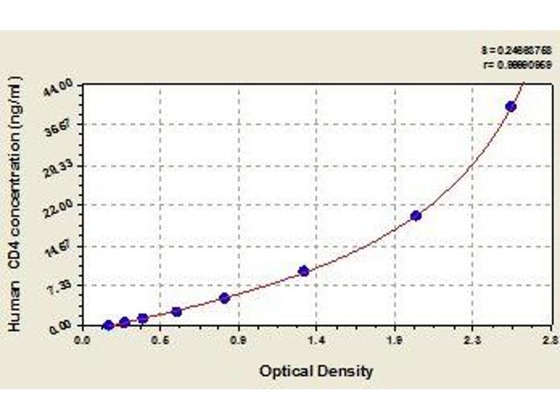 Antibody specific for CD4 has been pre-coated onto a microplate. Standards and samples are pipetted into the wells and any CD4 present is bound by the immobilized antibody. After removing any unbound substances, a biotin-conjugated antibody specific for CD4 is added to the wells. After washing, avidin conjugated Horseradish Peroxidase (HRP) is added to the wells. Following a wash to remove any unbound avidin-enzyme reagent, a substrate solution is added to the wells and color develops in proportion to the amount of CD4 bound in the initial step. The color development is stopped and the intensity of the color is measured.