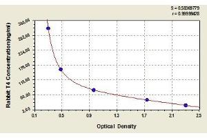 Create a standard curve by reducing the data using computer software capable of generating a four parameter logistic (4-PL) curve fit. As an alternative, construct a standard curve by plotting the mean absorbance for each standard on the x-axis against the concentration on the y-axis and draw a best fit curve through the points on the graph. The data may be linearized by plotting the log of the target antigen concentration versus the log of the O.D. and the best fit line can be determined by regression analysis. This procedure will produce an adequate but less precise fit of the data.