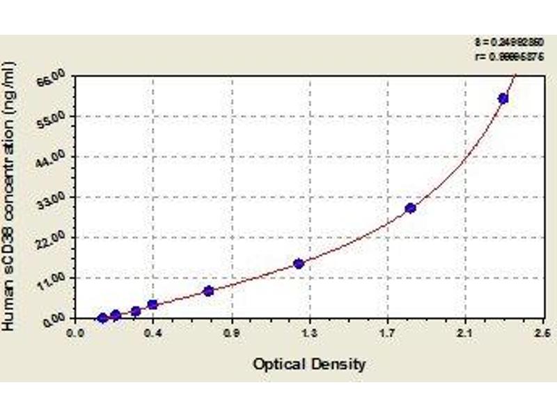 This assay employs the quantitative sandwich enzyme immunoassay technique. Antibody specific for sCD38 has been pre-coated onto a microplate. Standards and samples are pipetted into the wells and any sCD38 present is bound by the immobilized antibody. After removing any unbound substances, a biotin-conjugated antibody specific for sCD38 is added to the wells. After washing, avidin conjugated Horseradish Peroxidase (HRP) is added to the wells. Following a wash to remove any unbound avidin-enzyme reagent, a substrate solution is added to the wells and color develops in proportion to the amount of sCD38 bound in the initial step. The color development is stopped and the intensity of the color is measured.