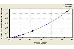Create a standard curve by reducing the data using computer software capable of generating a four parameter logistic (4-PL) curve fit. As an alternative, construct a standard curve by plotting the mean absorbance for each standard on the x-axis against the concentration on the y-axis and draw a best fit curve through the points on the graph. The data may be linearized by plotting the log of the target antigen concentration versus the log of the O.D. and the best fit line can be determined by regression analysis. This procedure will produce an adequate but less precise fit of the data.
