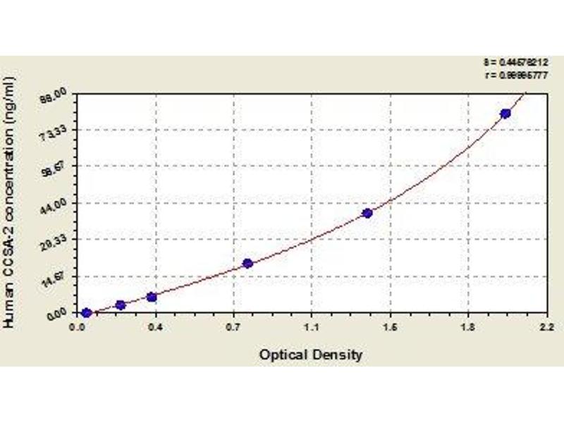 - The microtiter plate provided in this kit has been pre-coated with an antibody specific to CCSA-2. Standards or samples are then added to the appropriate microtiter plate wells with a Horseradish Peroxidase (HRP) -conjugated antibody preparation specific for CCSA-2 and incubated. Then substrate solutions are added to each well. The enzyme-substrate reaction is terminated by the addition of a sulphuric acid solution and the color change is measured spectrophotometrically at a wavelength of 450 nm ± 2 nm. The concentration of CCSA-2 in the samples is then determined by comparing the O.D. of the samples to the standard curve.