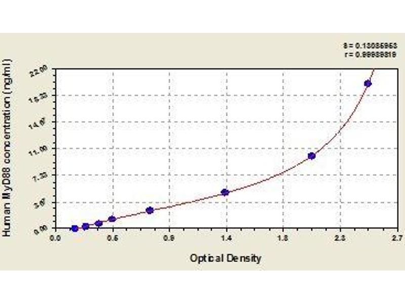 - Antibody specific for MYD88 has been pre-coated onto a microplate. Standards and samples are pipetted into the wells and any MYD88 present is bound by the immobilized antibody. After removing any unbound substances, a biotin-conjugated antibody specific for MYD88 is added to the wells. After washing, avidin conjugated Horseradish Peroxidase (HRP) is added to the wells. Following a wash to remove any unbound avidin-enzyme reagent, a substrate solution is added to the wells and color develops in proportion to the amount of MYD88 bound in the initial step. The color development is stopped and the intensity of the color is measured.