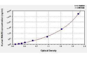 This assay employs the quantitative sandwich enzyme immunoassay technique. Antibody specific for WARS has been pre-coated onto a microplate. Standards and samples are pipetted into the wells and any WARS present is bound by the immobilized antibody. After removing any unbound substances, a biotin-conjugated antibody specific for WARS is added to the wells. After washing, avidin conjugated Horseradish Peroxidase (HRP) is added to the wells. Following a wash to remove any unbound avidin-enzyme reagent, a substrate solution is added to the wells and color develops in proportion to the amount of WARS bound in the initial step. The color development is stopped and the intensity of the color is measured.