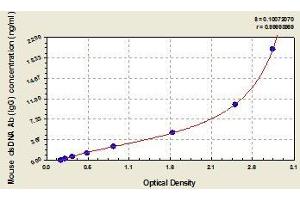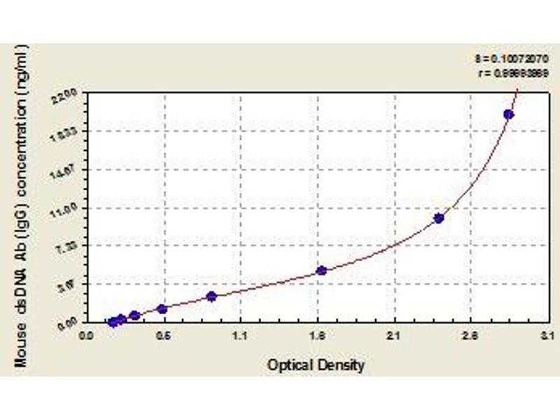 - The microtiter plate provided in this kit has been pre-coated with anti-mouse IgG antibody. Standards or samples are then added to the appropriate microtiter plate wells with biotin-conjugated dsDNA and Avidin conjugated to Horseradish Peroxidase (HRP) is added to each microplate well and incubated. Then a TMB (3,3',5,5' tetramethyl-benzidine) substrate solution is added to each well. Only those wells that contain anti-mouse IgG antibody, biotin-conjugated dsDNA and enzyme-conjugated Avidin will exhibit a change in color. The enzyme-substrate reaction is terminated by the addition of a sulphuric acid solution and the color change is measured spectrophotometrically at a wavelength of 450 nm ± 2 nm. The concentration of anti-double stranded DNA antibody(IgG) in the samples is then determined by comparing the O.D. of the samples to the standard curve.