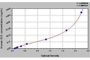 - The microtiter plate provided in this kit has been pre-coated with an antibody specific to IDO. Standards or samples are then added to the appropriate microtiter plate wells with a biotin-conjugated antibody preparation specific for IDO and Avidin conjugated to Horseradish Peroxidase (HRP) is added to 3 each microplate well and incubated. Then a TMB (3,3',5,5' tetramethyl-benzidine) substrate solution is added to each well. Only those wells that contain IDO, biotin-conjugated antibody and enzyme-conjugated Avidin will exhibit a change in color. The enzyme-substrate reaction is terminated by the addition of a sulphuric acid solution and the color change is measured spectrophotometrically at a wavelength of 450 nm ± 2 nm. The concentration of IDO in the samples is then determined by comparing the O.D. of the samples to the standard curve.
