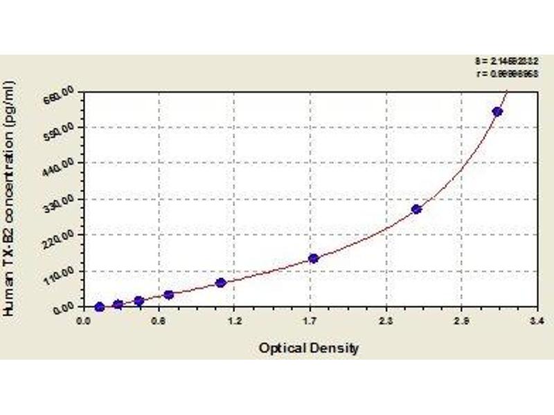 This assay employs the quantitative sandwich enzyme immunoassay technique. Antibody specific for TX-B2 has been pre-coated onto a microplate. Standards and samples are pipetted into the wells and any TX-B2 present is bound by the immobilized antibody. After removing any unbound substances, a biotin-conjugated antibody specific for TX-B2 is added to the wells. After washing, avidin conjugated Horseradish Peroxidase (HRP) is added to the wells. Following a wash to remove any unbound avidin-enzyme reagent, a substrate solution is added to the wells and color develops in proportion to the amount of TX-B2 bound in the initial step. The color development is stopped and the intensity of the color is measured.