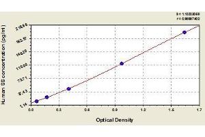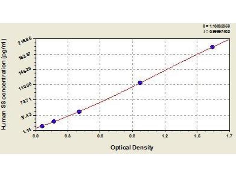 This assay employs the quantitative sandwich enzyme immunoassay technique. Antibody specific for SS has been pre-coated onto a microplate. Standards and samples are pipetted into the wells with a Horseradish Peroxidase (HRP) conjugated antibody specific for SS. Following a wash to remove any unbound reagent, a substrate solution is added to the wells and color develops in proportion to the amount of SS bound in the initial step. The color development is stopped and the intensity of the color is measured.