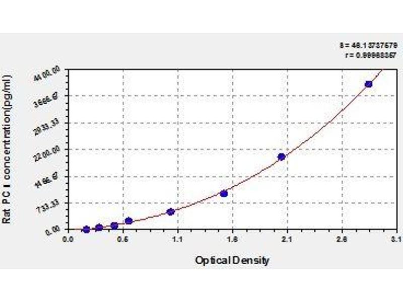 Create a standard curve by reducing the data using computer software capable of generating a four parameter logistic (4-PL) curve fit. As an alternative, construct a standard curve by plotting the mean absorbance for each standard on the x-axis against the concentration on the y-axis and draw a best fit curve through the points on the graph. The data may be linearized by plotting the log of the target antigen concentration versus the log of the O.D. and the best fit line can be determined by regression analysis. This procedure will produce an adequate but less precise fit of the data.