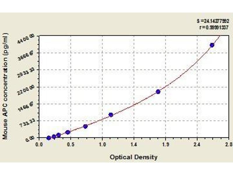 This assay employs the quantitative sandwich enzyme immunoassay technique. Antibody specific for APC has been pre-coated onto a microplate. Standards and samples are pipetted into the wells and any APC present is bound by the immobilized antibody. After removing any unbound substances, a biotin-conjugated antibody specific for APC is added to the wells. After washing, avidin conjugated Horseradish Peroxidase (HRP) is added to the wells. Following a wash to remove any unbound avidin-enzyme reagent, a substrate solution is added to the wells and color develops in proportion to the amount of APC bound in the initial step. The color development is stopped and the intensity of the color is measured.