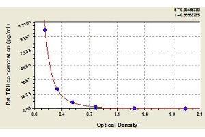 - This assay employs the competitive inhibition enzyme immunoassay technique. The microtiter plate provided in this kit has been pre-coated with goat-anti-rabbit antibody. Standards or samples are added to the appropriate microtiter plate wells with an antibody specific for TRH and Horseradish Peroxidase (HRP) conjugated TRH. The competitive inhibition reaction is launched between with HRP labeled TRH and unlabeled TRH with the antibody. A substrate solution is added to the wells and the color develops in opposite to the amount of TRH in the sample. The color development is stopped and the intensity of the color is measured.