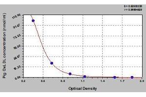 Create a standard curve by reducing the data using computer software capable of generating a four parameter logistic (4-PL) curve fit. As an alternative, construct a standard curve by plotting the mean absorbance for each standard on the x-axis against the concentration on the y-axis and draw a best fit curve through the points on the graph. The data may be linearized by plotting the log of the target antigen concentration versus the log of the O.D. and the best fit line can be determined by regression analysis. This procedure will produce an adequate but less precise fit of the data.