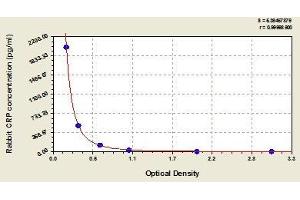 - The microtiter plate provided in this kit has been pre-coated with rabbit CRP. Standards or samples are then added to the appropriate microtiter plate wells with Horseradish Peroxidase (HRP) -conjugated antibody preparation specific for rabbit CRP, mix well and incubated. The more the amount of rabbit CRP in samples, the less HRP-antibody bound by pre-coated rabbit CRP. Then a TMB (3,3',5,5' tetramethyl-benzidine) substrate solution is added to each well. And the color develops in opposite to the amount of rabbit CRP in the sample. The color development is stopped and the intensity of the color is measured.