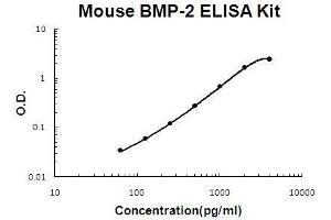 - mouse BMP-2 ELISA Kit was based on standard sandwich enzyme-linked immune-sorbent assay technology. A monoclonal antibody from rat specific for BMP-2 has been precoated onto 96-well plates. Standards(CHO, Q283-R396) and test samples are added to the wells, a biotinylated detection polyclonal antibody from goat specific for BMP-2 is added subsequently and then followed by washing with PBS or TBS buffer. Avidin-Biotin-Peroxidase Complex was added and unbound conjugates were washed away with PBS or TBS buffer. HRP substrate TMB was used to visualize HRP enzymatic reaction. TMB was catalyzed by HRP to produce a blue color product that changed into yellow after adding acidic stop solution. The density of yellow is proportional to the mouse BMP-2 amount of sample captured in plate.