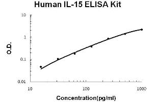 - human IL-15 ELISA Kit was based on standard sandwich enzyme-linked immune-sorbent assay technology. A monoclonal antibody from mouse specific for IL-15 has been precoated onto 96-well plates. Standards(E.coli, N49-S162) and test samples are added to the wells, a biotinylated detection polyclonal antibody from goat specific for IL-15 is added subsequently and then followed by washing with PBS or TBS buffer. Avidin-Biotin-Peroxidase Complex was added and unbound conjugates were washed away with PBS or TBS buffer. HRP substrate TMB was used to visualize HRP enzymatic reaction. TMB was catalyzed by HRP to produce a blue color product that changed into yellow after adding acidic stop solution. The density of yellow is proportional to the human IL-15 amount of sample captured in plate.