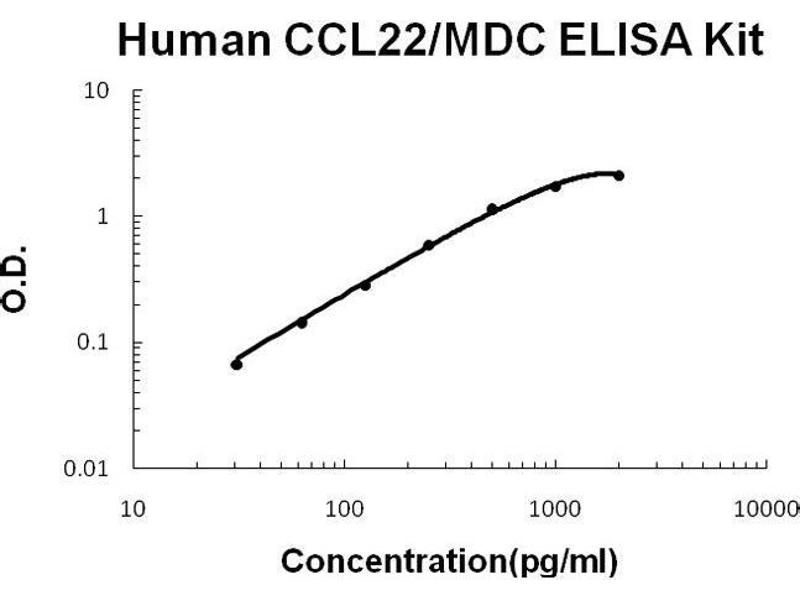 Background: Macrophage-derived chemokine(MDC), also called Chemokine, cc motif, ligand 22(CCL22) or Small inducible cytokine subfamily A, member 22(SCY22). MDC is a recently identified member of the CC chemokine family. It is not closely related to other chemokines, sharing most similarity with thymus- and activation-regulated chemokine(TARC), which contains 37 % identical amino acids. In addition, MDC gene is mapped to chromosome 16q13, the same position reported for the TARC gene. MDC has the four-cysteine motif and other highly conserved residues characteristic of CC chemokines, but it shares<35 % identity with any of the known chemokines. Recombinant MDC was expressed in Chinese hamster ovary cells and purified by heparin-Sepharose chromatography. MDC is highly expressed in macrophages and in monocyte-derived dendritic cells, but not in monocytes, natural killer cells, or several cell lines of epithelial, endothelial, or fibroblast origin. High expression was also detected in normal thymus and less expression in lung and spleen. MDC is thus a unique member of the CC chemokine family that may play a fundamental role in the function of dendritic cells, natural killer cells, and monocytes.