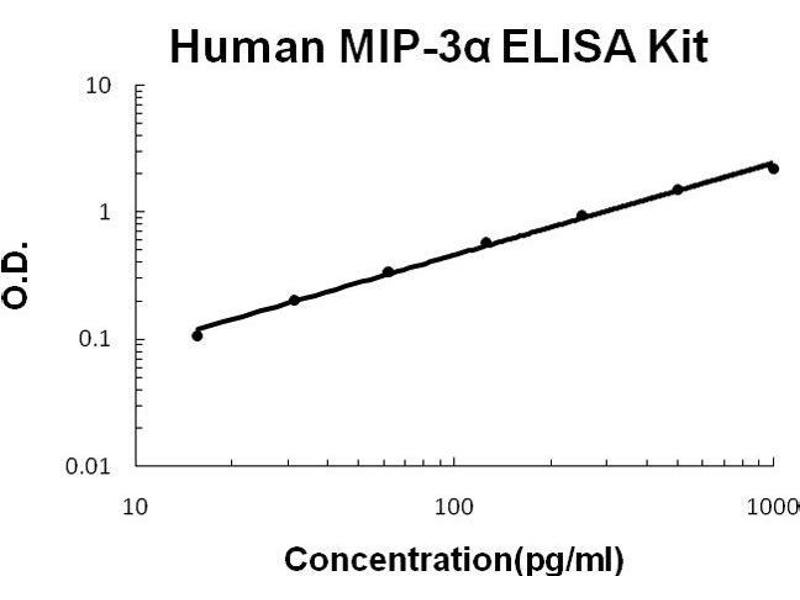 - human MIP-3 alpha ELISA Kit was based on standard sandwich enzyme-linked immune-sorbent assay technology. A monoclonal antibody from mouse specific for MIP-3 alpha has been precoated onto 96-well plates. Standards(E.coli, A27-M96) and test samples are added to the wells, a biotinylated detection polyclonal antibody from goat specific for MIP-3 alpha is added subsequently and then followed by washing with PBS or TBS buffer. Avidin-Biotin-Peroxidase Complex was added and unbound conjugates were washed away with PBS or TBS buffer. HRP substrate TMB was used to visualize HRP enzymatic reaction. TMB was catalyzed by HRP to produce a blue color product that changed into yellow after adding acidic stop solution. The density of yellow is proportional to the human MIP-3 alpha amount of sample captured in plate.