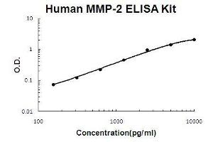 - human MMP-2 ELISA Kit was based on standard sandwich enzyme-linked immune-sorbent assay technology. A monoclonal antibody from mouse specific for MMP-2 has been precoated onto 96-well plates. Standards(NSO, A30-C660) and test samples are added to the wells, a biotinylated detection polyclonal antibody from goat specific for MMP-2 is added subsequently and then followed by washing with PBS or TBS buffer. Avidin-Biotin-Peroxidase Complex was added and unbound conjugates were washed away with PBS or TBS buffer. HRP substrate TMB was used to visualize HRP enzymatic reaction. TMB was catalyzed by HRP to produce a blue color product that changed into yellow after adding acidic stop solution. The density of yellow is proportional to the human MMP-2 amount of sample captured in plate.