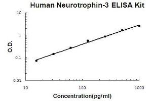 - human Neurotrophin-3 ELISA Kit was based on standard sandwich enzyme-linked immune-sorbent assay technology. A monoclonal antibody from mouse specific for Neurotrophin-3 has been precoated onto 96-well plates. Standards(sf21, Y139-T257) and test samples are added to the wells, a biotinylated detection polyclonal antibody from goat specific for Neurotrophin-3 is added subsequently and then followed by washing with PBS or TBS buffer. Avidin-Biotin-Peroxidase Complex was added and unbound conjugates were washed away with PBS or TBS buffer. HRP substrate TMB was used to visualize HRP enzymatic reaction. TMB was catalyzed by HRP to produce a blue color product that changed into yellow after adding acidic stop solution. The density of yellow is proportional to the human Neurotrophin-3 amount of sample captured in plate.