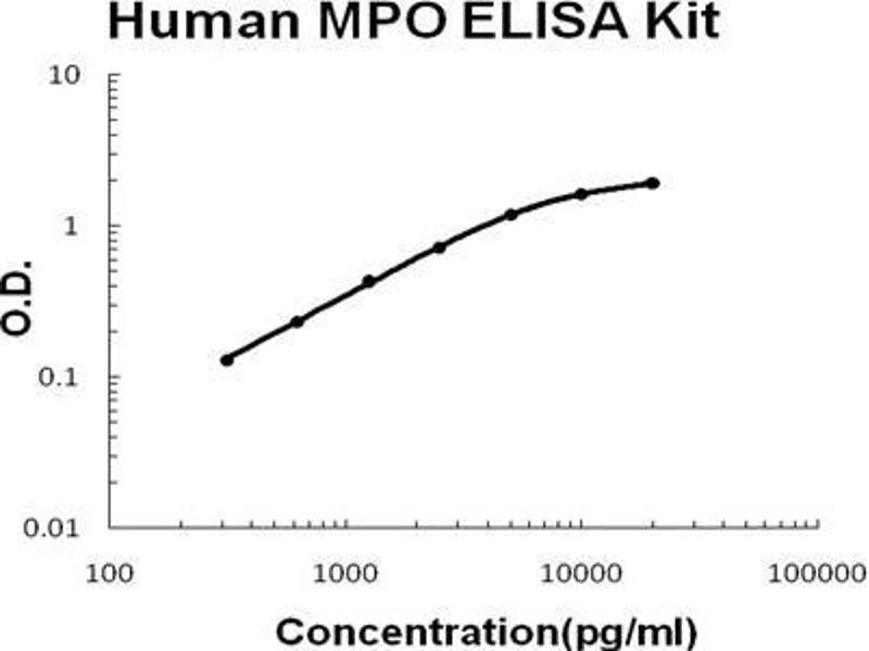 Background: Myeloperoxidase(MPO) is a mammalian phagocyte hemoprotein thought to primarily mediate host defense reactions. It is abundantly expressed in neutrophils and secreted during their activation. Myeloperoxidase is part of the host defense system of human polymorphonuclear leukocytes, responsible for microbicidal activity against a wide range of organisms. It is located in the nucleus as well as in the cytoplasm. Intranuclear MPO may help to protect DNA against damage resulting from oxygen radicals produced during myeloid cell maturation and function. The standard product used in this kit is the product of gene recombination, consisting of 697(A49-S745) amino acids with the molecular mass of 80KDa.