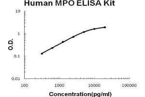 - human MPO ELISA Kit was based on standard sandwich enzyme-linked immune-sorbent assay technology. A monoclonal antibody from mouse specific for MPO has been precoated onto 96-well plates. Standards(NSO, A49-S745) and test samples are added to the wells, a biotinylated detection polyclonal antibody from goat specific for MPO is added subsequently and then followed by washing with PBS or TBS buffer. Avidin-Biotin-Peroxidase Complex was added and unbound conjugates were washed away with PBS or TBS buffer. HRP substrate TMB was used to visualize HRP enzymatic reaction. TMB was catalyzed by HRP to produce a blue color product that changed into yellow after adding acidic stop solution. The density of yellow is proportional to the human MPO amount of sample captured in plate.