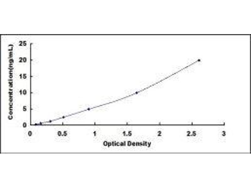 2. Standard - Reconstitute the Standard with 1.0 mL of Standard Diluent, keep for 10 minutes at room temperature, shake gently (not to foam). The concentration of the standard in the stock solution is 20 ng/mL. Prepare 7 tubes containing 0.5 mL Standard Diluent and produce a double dilution series. Mix each tube thoroughly before the next transfer. Set up 7 points of diluted standard such as 20 ng/mL, 10 ng/mL, 5 ng/mL, 2.5 ng/mL, 1.25 ng/mL, 0.625 ng/mL, 0.312 ng/mL, and the last microcentrifuge tube with Standard Diluent is the blank as 0 ng/mL.