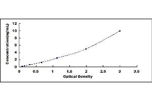 In order to make the calculation easier, we plot the O.D. value of the standard (X-axis) against the known concentration of the standard (Y-axis), although concentration is the independent variable and O.D. value is the dependent variable. However, the O.D. values of the standard curve may vary according to the conditions of assay performance (e.g. operator, pipetting technique, washing technique or temperature effects), plotting log of the data to establish standard curve for each test is recommended. Typical standard curve below is provided for reference only.