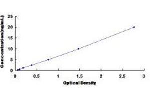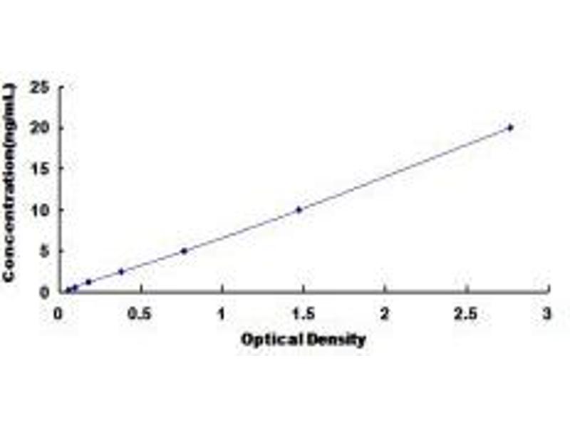 Average the duplicate readings for each standard, control, and samples and subtract the average zero standard optical density. Create a standard curve on log-log graph paper, with FLCN concentration on the y-axis and absorbance on the x-axis. Draw the best fit straight line through the standard points and it can be determined by regression analysis. Using some plot software, for instance, curve expert 1.30, is also recommended. If samples have been diluted, the concentration read from the standard curve must be multiplied by the dilution factor.