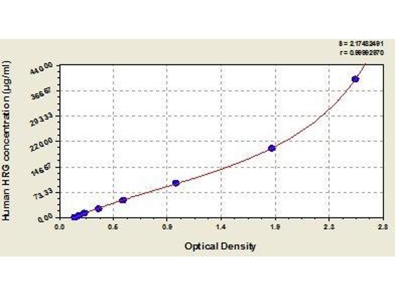 Antibody specific for HRG has been pre-coated onto a microplate. Standards and samples are pipetted into the wells and any HRG present is bound by the immobilized antibody. After removing any unbound substances, a biotin-conjugated antibody specific for HRG is added to the wells. After washing, avidin conjugated Horseradish Peroxidase (HRP) is added to the wells. Following a wash to remove any unbound avidin-enzyme reagent, a substrate solution is added to the wells and color develops in proportion to the amount of HRG bound in the initial step. The color development is stopped and the intensity of the color is measured.