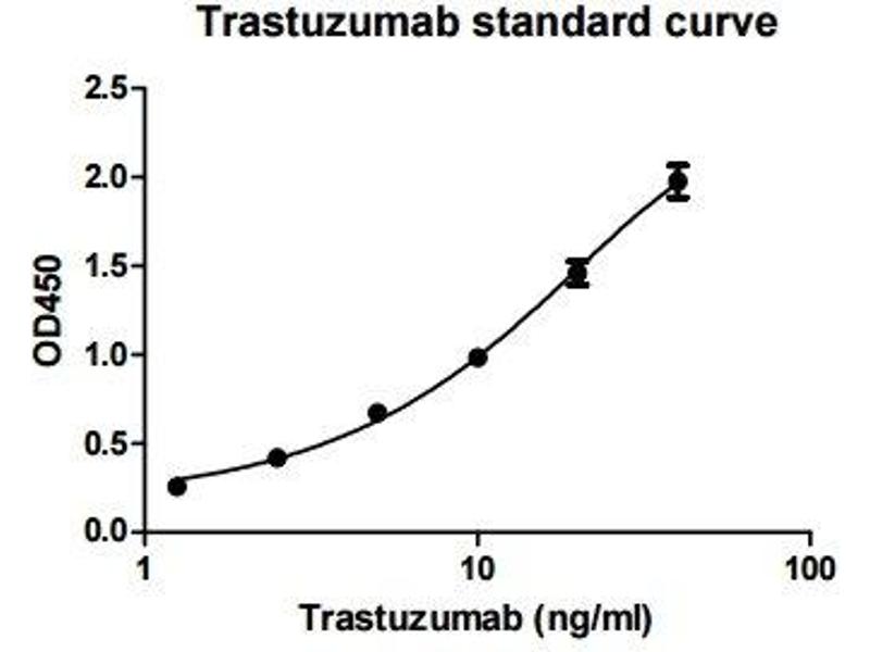 - The Trastuzumab ELISA kit is designed to measure free Trastuzumab with high specificity and sensitivity . This assay employs the sandwich enzyme immunoassay technique. A precoated anti-Trastuzumab 96 well plate is provided. Calibrator, quality control samples and test samples are pipetted into the appropriate wells. Trastuzumab present in biological matrices is bound by the immobilized capture antibody. After washing away any unbound substances, enzyme linked detection antibody is added to the wells. The plate is washed to remove any unbound antibody-enzyme reagent and a substrate solution is added to the wells for color development. The color development is proportional to the amount of Trastuzumab present in test samples and the concentration is calculated from the standard series.