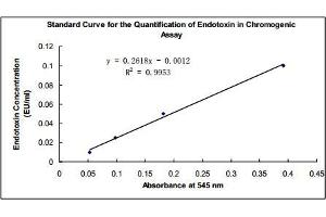Under the standard conditions, the absorbance at 545 nm shows a linear relationship with the concentration in the range of 0.01 to 1 EU/mL. Plot the absorbance for the four standards on the x-axis and the corresponding endotoxin concentration in EU/mL on the y-axis. Draw a best-fit straight line between these points and determine endotoxin concentrations of samples graphically.