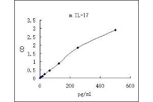 - Mouse Interleukin 17 (IL-17, also known as IL-17A and CTLA-8) is a 21 kDa, variably glycosylated polypeptide that belongs to the IL-17 family of cytokines containing a cysteine-knot fold (1-3). Its sequence was originally isolated from an activated hybridoma created from the fusion of a mouse cytotoxic and rat T cell lymphoma cell line (2-5). It is synthesized as a 158 amino acid (aa) precursor that contains a 25 aa signal sequence and a 15 kDa, 133 aa mature segment (5). In both mouse and human, there is one conserved N-linked glycosylation site that likely contributes 5 kDa to its native molecular weight. IL-17A forms both a 35-38 kDa homodimer,and a 45-48 kDa heterodimer with IL-17F (6, 7). Mature mouse IL-17A is 61 % and 89 % aa identical to human and rat IL-17A, respectively (4, 5, 8). While rodent and human mature sequences show modest aa sequence identity, human IL-17 is active on both mouse and rat cells (5, 9). Cells known to produce IL-17 are the CD4+ Th17 T cells, Paneth cells, GR1+CD11b+ myeloid suppressor cells, CD27-γδ T cells, CD1+NK1.1- iNKT cells and CD3-CD4+ LTi-like cells(3, 5, 6, 10-12).A high affinity receptor for mouse IL-17 has been reported, and appears to be a heteromultimer of IL-17RA and IL-17RC, likely in a 2:1 ratio (1). IL-17RA is a 130 kDa, type I transmembrane glycoprotein that bears no resemblance to members of the cytokine, TNF or immunoglobulin receptor superfamily (2, 10, 13). IL-17RC is also a type I transmembrane protein, approximately 90-95 kDa in size, that shares less than 30 % aa identity with IL-17RA (14, 15). Both receptors are needed for IL-17A and IL-17A/F activity. The two receptors appear to form a functional association following ligand binding to IL-17RA (1, 16).IL-17 is best known for its participation in the recruitment and survival of neutrophils (3, 10, 17,18). Its induction was initially described to be the result of antigen stimulation of dentritic cells, resulting in IL-23 secretion. In a TCR-independent event, IL-23 induces T cell production of IL-17(3). Once secreted, IL-17 in the bone marrow would seem to induce stromal/fibroblast expression of both G-CSF and SCF (membrane form), an effect that increases neutrophil differentiation and activation. IL-17 may complement this by directly blocking neutrophil apoptosis, promoting greater circulating neutrophil numbers (17). In the tissues, IL-17 seems to promote neutrophil extravasation, principally through its effects on macrophages and endothelial cells (EC). On macrophages, IL-17 induces TNF-α, IL-1β and IL-6 production (19).TNF-α and IL-1β then act on local ECs to induce G-CSF secretion, an effect that is potentiated by IL-17 (20). IL-17 further contributes to neutrophil influx by inducing EC CXC chemokine release and NO production, which may increase vascular permeability (3, 9). IL-17 effects are not limited to neutrophils. In synovial joints, IL-17 upregulates RANKL expression on osteoblasts. This provides a stimulus for osteoclast formation and subsequent bone resorption (18).