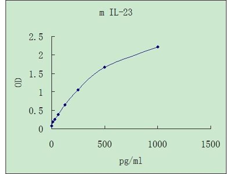 - Interleukin 23 (IL-23) is a heterodimeric cytokine that is related to IL-12 (1-3). It is composed of two disulfide-linked subunits, a 19 kDa (p19) subunit that is unique to IL-23, and a 40 kDa (p40, IL-12) subunit that is shared with IL-12 (3-7). Mature mouse p19 and p40 share 88 % and 92 % aa sequence identity, respectively, with the corresponding rat subunits. IL-23 is produced by activated macrophages, microglia, and monocyte-derived dendritic cells in response to pathogens including certain bacteria and viruses and/or their components (3, 6). The functional IL-23 receptor complex consists of two receptor subunits, the IL-12 receptor-1 subunit (IL-12 Rβ1) and the IL-23-specific receptor subunit (IL-23 R) (7). IL-23 and IL-12 have overlapping and distinct biological activities. The IL-23 immune pathway induces the earliest recruitment of neutrophils to the site of infection, while the more classic host defense and cytotoxic response is stimulated by IL-12 (4). IL-23 has a role in the development and maintenance of a T cell subset, designated Th17, that is characterized by the production of IL-17A, IL-17F, IL-6, and TNF-α(3, 4, 8). The IL-23/IL-17 axis is an important mediator of inflammation. In mouse models, transgenic over-expression of IL-23 leads to a lethal systemic infl ammatory response (9). IL-23 eff ects on Th17 cells may also enhance the development of several models of autoimmune disease including experimental allergic encephalomyelitis (EAE), collagen-induced arthritis (CIA), colitis, and diabetes (5, 8, 10-14). IL-23 may also play a role in increased tumor growth associated with chronic inflammation (15).