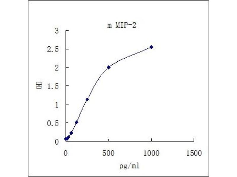 - Mouse macrophage inflammatory protein-2 (MIP-2), also known as CXCL2, was originally identified as a heparin-binding protein secreted by an LPS-stimulated mouse macrophage cell line (1). A cDNA clone encoding the protein was isolated from this cell line and characterized (2). Based on its protein and DNA sequences, mouse MIP-2 was classified as a member of the alpha (CXC) chemokine family of inflammatory and immunoregulatory cytokines (3).Mouse MIP-2 cDNA encodes a 100 amino acid residue precursor protein from which the amino-terminal 27 amino acid residues are cleaved to generate the mature mouse MIP-2. The protein sequence of mouse MIP-2 shows approximately 63 % identity to that of mouse KC, another mouse alpha chemokine. Mouse MIP-2 is also 60 % identical to human GROβ and GROγ(2). Based on these protein sequence similarities, it is likely that mouse KC and MIP-2 are homologs of human GROα, β and γ chemokines. Since chemokines with protein sequence homology to human IL-8 have not been identified in mice, it has been suggested that the mouse KC and MIP-2 are functional homologs of human IL-8 in mice (3, 4). A putative mouse homolog of the human IL-8 receptor beta (IL-8 Rβ) has also been cloned. This receptor shows 71 % identity to human IL-8 Rβ and 68 % identity to human IL-8 Rα. Both mouse KC and MIP-2 bind mouse IL-8 Rβ with high affinity (5).Like human IL-8, mouse MIP-2 exhibits potent neutrophil chemotactic activity and may be a key mediator of neutrophil recruitment in response to tissue injury and infection (3, 4). Increased MIP-2 expression has been found to be associated with neutrophil influx in various inflammatory conditions (6 - 10).