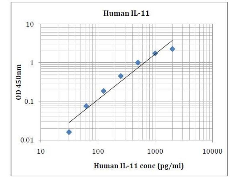 - This kit was based on sandwich enzyme-linked immune-sorbent assay technology. Anti- Human IL-11antibody was pre-coated into 96-well plates. Biotin conjugated anti-humanIL-11detection antibody was used. Standards, test samples and biotin conjugated detection antibody were added to the wells subsequently. Wash buffer was used to wash any non-specific binding. HRP conjugated Streptavidin was used as secondary antibody. TMB substrates were used to visualize HRP enzymatic reaction. TMB was catalyzed by HRP to produce a blue color product that changed into yellow after adding acidic stop solution. The density of yellow is proportional to the Human IL-11amount of samples captured in the plate. Optical Density (O.D) can be read at absorbance 450nm in a microplate reader. Concentration of Human IL-11 can be calculated using the standard curve.