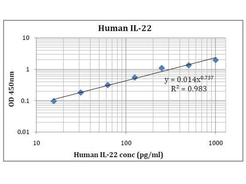 - This assay employs an antibody specific for Anti-humanIL-22 coated on a 96-well plate. Standards and samples are pipetted into the wells and IL-22 present in a sample is bound to the wells by the immobilized antibody. The wells are washed and biotinylated anti-humanIL-22 antibody is added. After washing away unbound biotinylated antibody, HRP-conjugated streptavidin is pipetted to the wells. The wells are again washed, a TMB substrate solution is added to the wells and color develops in proportion to the amount of IL-22 bound. The Stop Solution changes the color from blue to yellow, and the intensity of the color is measured at 450 nm.