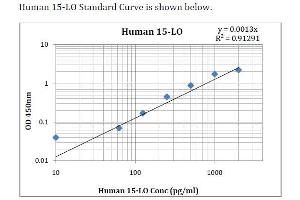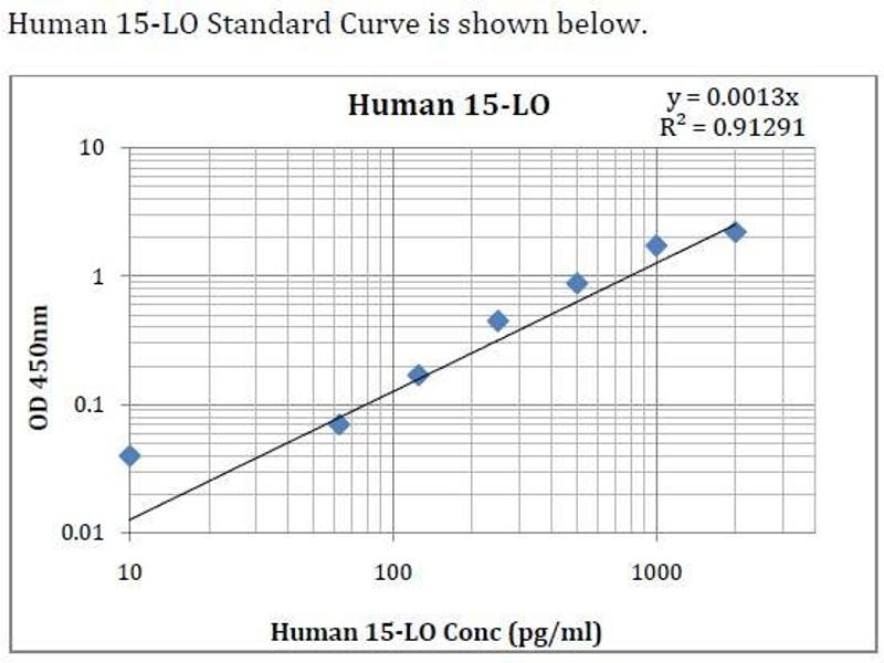 This assay employs an antibody specific for Anti-human 15-LO coated on a 96-well plate. Standards and samples are pipetted into the wells and 15-LO present in a sample is bound to the wells by the immobilized antibody. The wells are washed and biotinylated anti-human 15-LO antibody is added. After washing away unbound biotinylated antibody, HRP-conjugated streptavidin is pipetted to the wells. The wells are again washed, a TMB substrate solution is added to the wells and color develops in proportion to the amount of 15-LO bound. The Stop Solution changes the color from blue to yellow, and the intensity of the color is measured at 450 nm.